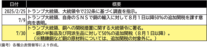 このように不透明な状況が数か月にわたって続く中、7月9日、トランプ大統領が自身のSNSで、銅の輸入に対して8月1日以降50%の追加関税を課す意向を表明し、関連産業への影響に対する懸念が高まった。その後、7月30日に関税措置が正式に決定され、銅の半製品及び同派生品に対して50%の追加関税が課されるに至った。なお、銅鉱石や精錬銅といった銅の原材料については結果的に関税措置の対象外となったが、貿易相手国にとってこうした詳細な措置の内容が判明するまでの間は、その発動時期に加えて関税措置の対象範囲についても不明瞭な状況下に置かれることとなり、8月以降の関税発動までの間も、米国の通商政策が関連産業に広く影響を及ぼすこととなった12。