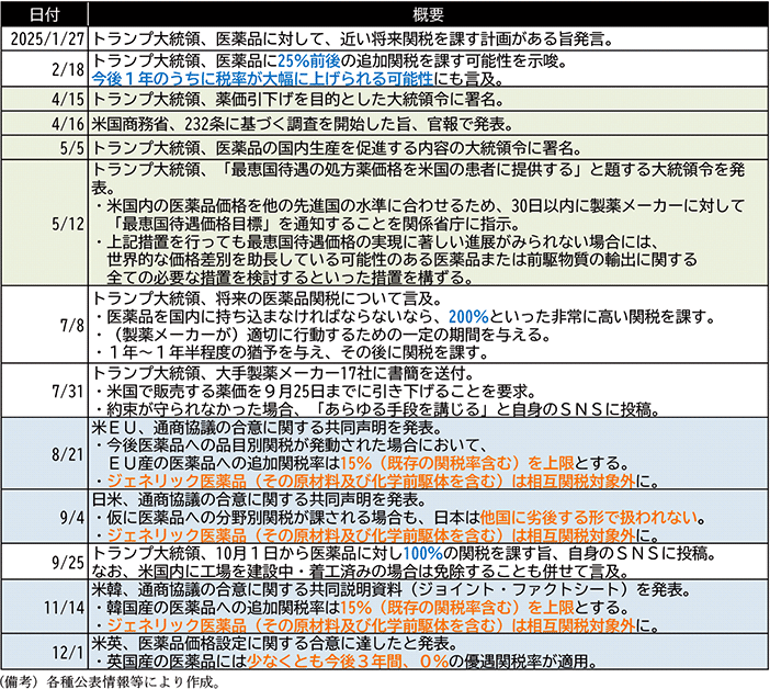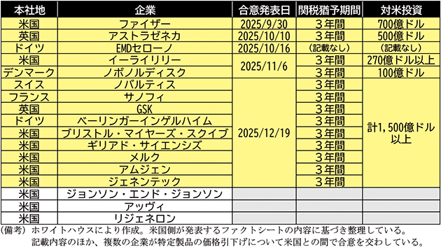こうして事業者への価格引下げ圧力がかけられる中、7月31日、トランプ大統領は各国の大手製薬メーカー17社に対して書簡を送付し、9月25日までの間に薬価を引き下げるよう迫った。この際、要求に応じなかった場合には価格引下げに向けて断固たる措置を講じていくことを表明しており、既に医薬品に対する100%以上の関税率を予定しているとの発言も確認されていたところ、関連産業への影響に対する懸念が高まっていた。そして9月末になると、トランプ大統領は10月以降の関税措置の発動を表明したものの、実際の発動は見送られたまま2026年1月に至っている。