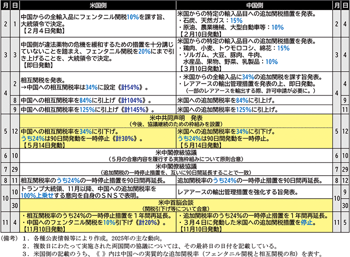 主要国・地域別の関税措置の動向として、まず特筆すべきは、第二次トランプ政権発足以前から関税措置の発動が示唆されていた中国をめぐる動向である。これまでの動向を振り返ると、両国間では関税措置をめぐって、一時は互いに100%以上の追加関税を課す「貿易戦争」ともいえるような事態にまで悪化する場面もありながら、結果的に2026年1月時点においては、中国に対する関税率は他の主要先進国と同程度のものとなるまでに状況は沈静化した(第1-1-15表)。この間の関税措置をめぐる動向は大きく揺れ動いており多分に不確実性を伴うものであったことから、通商政策による財貿易等への短期的な影響を把握するに当たって、その動向を振り返っておくことが重要である。以下では、現在の措置に至るまでの経緯について振り返ることとしたい。