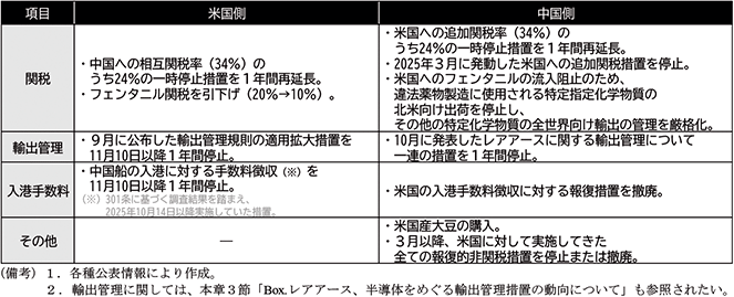 こうした報復のエスカレーションは、5月中旬に米中間で関税率を相互に引き下げる旨の合意に至ったことで、緩和することになった。それまで100%を超えていた両国間の追加関税率は、5月14日以降、米国側計30%(フェンタニル関税計20%及び当初賦課予定としていた相互関税率34%のうち10%。)、中国側10%(2月及び3月に導入した特定の品目群に対する追加関税は別途維持。)にまで引き下げられた。ただし、米国側は当初賦課予定としていた相互関税率34%を撤回するまでには至らず、対する中国側も4月当初に設定した追加関税率34%は維持したまま、双方がうち24%分について8月12日まで適用を一時停止する扱いとした上で、両国間での通商協議継続のための枠組みが設置されることとなった。