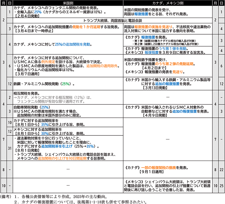 米国と隣接する2か国であり主要な貿易相手国に当たるカナダ、メキシコに対しては、第二次トランプ政権発足から間もなく関税措置が発動されたが、その後のカナダ、メキシコ側からの報復措置の表明も踏まえて追加関税を緩和する例外規定が設けられた中で、相互関税や品目別関税の発動も重なって各種の措置が交錯し、その全体像は複雑なものとなった(第1-1-17表)。以後、これまでの経緯について詳述する。