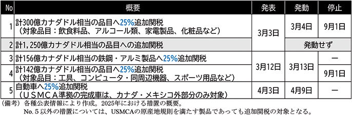 (カナダは米国に対して報復措置を発動するも、その後は一部停止へ)