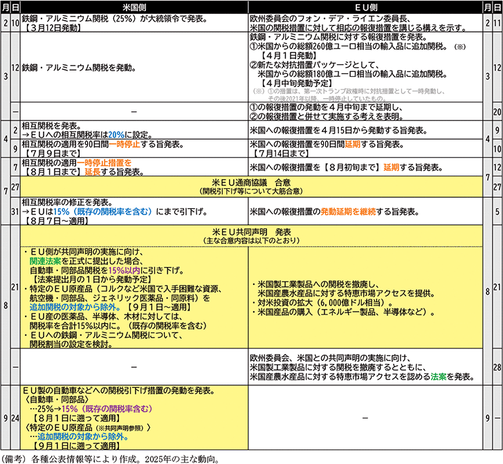 2025年7月末の米EU間の合意後も、日本同様、合意内容の実現に向けて米国との交渉は継続され、8月21日には合意内容に関する共同声明を双方が公表し、関税引下げについて条件や時期を明記するなど、合意内容の実施に向けた動きが着実に進められた。そうした中、自動車・同部品関税を引き下げる要件として定められたEU側の米国に対する市場開放に向けた動きが8月末に進められたことも踏まえ、最終的な実現までには期間を要したものの、9月下旬に米国側がEUに対する関税引下げ措置を発表・発動するに至った。特に、自動車・同部品関税の引下げについては、共同声明の取り決めに基づき、8月1日に遡及して適用されることとなった。