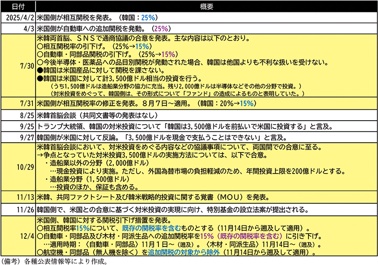 こうして両国間での協議が続く中、10月末に開かれた米韓首脳会談において、2,000億ドルの対米投資については現金投資により実施することとした上で、外国為替市場への影響に配慮しその年間投資上限を200億ドルとすることで合意し、自動車関税の引下げ等関税措置の緩和に向けて前進することとなった。その後、11月13日に合意に係る両国の共同ファクトシートが公表され、11月末には韓国側が対米投資に向けた具体的な準備を進めたことも受けて、米国は12月4日、韓国に対する関税率引下げの実施を発表し、自動車関税は11月1日から遡及適用される形で15%(既存の関税率を含む)に引き下げられた。また、相互関税についても、11月14日に遡及して日本、EUと同様に関税率が既存分を含めて15%となるよう緩和された。いずれにせよ、交渉の長期化により、韓国は日本、EUと比較して自動車産業等の分野において関税の影響を相対的に強く受ける状況が続いた21。