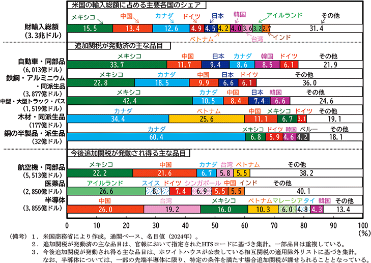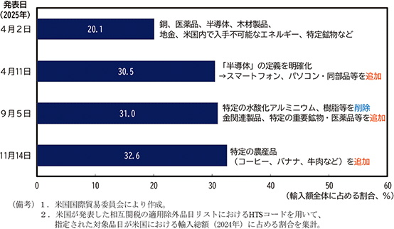 第二次トランプ政権では、全ての貿易相手国を対象とする広範な相互関税措置が講じられたわけだが、例外措置として、将来的に品目別関税が課される可能性のある品目のほか、米国内産業へのサプライチェーン上の影響が及ばないよう米国内では入手不可能な資源等については相互関税の対象外とされている。具体的には、2025年4月当初から、医薬品、半導体26、原油等については対象外とされており、その後スマートフォン、パソコン、半導体製造装置といった半導体関連製品も対象外品目に含められ、米国の輸入総額のうちおよそ3割程度を占める品目が関税措置による影響を受けない構造となった(第1-1-23図)。