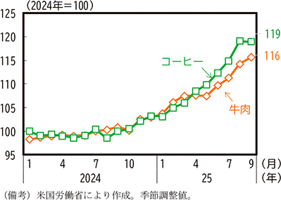 対象外品目は4月当初以降、複数回にわたる修正を経て増減している。9月には特定の水酸化アルミニウム、樹脂、シリコン製品等が対象外品目から削除された一方で、金関連製品27や特定の重要鉱物・医薬品等が追加された28。また、11月には相互関税をめぐる交渉の著しい進展及び特定の製品に対する国内での需要動向・生産能力等に鑑みた上で、米国では生産されていない品目を中心に特定の農産品が相互関税の対象外品目に追加された。実際、追加された代表的な対象外品目としてコーヒー及び牛肉の米国内における物価動向をみると、そもそも供給量が減少基調にあった中で関税措置がとられたこともあり、2025年以降、いずれも価格の上昇ペースが加速していた(第1-1-24図)。こうした動向への対応策として追加関税の対象外品目を拡大することで、関税措置を通じた米国内への影響の緩和を図る動きもみられてきた。