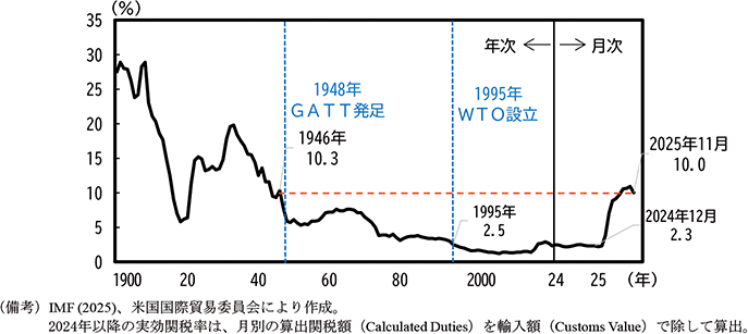 これまでみてきたように、第二次トランプ政権の関税措置は多岐にわたっているが、それらを総合的にみるため、米国が輸入全体に対して課している実効関税率の動向を確認する。バイデン政権下の2024年から第二次トランプ政権発足直後の2025年初頭にかけては、米国の実効関税率は2%台前半で安定的に推移してきた。その後、中国、カナダ、メキシコへの関税措置が本格化した3月頃から明確に上昇し始め、相互関税や自動車関税が導入され、米中間で相互に100%を超えるまで関税が引き上げられた5月には8.8%まで急激に上昇した。その後も関税率の引上げや対象品目の拡大が続いたが、米中間の関税が引き下げられたこともあり、実効関税率の上昇ペースは緩やかとなり、11月時点では10.0%となっている。それでも、一連の関税措置が導入される以前のバイデン政権末期の水準と比較すると4倍強という大幅な上昇となっており、歴史的にみれば第二次世界大戦の無視できない要因が関税や輸入制限による保護主義・ブロック経済化にあったとの反省の下、その後の世界的な貿易自由化の推進力となったGATT発足前の1946年頃と同程度の水準まで後戻りすることとなった(第1-1-25図)。
