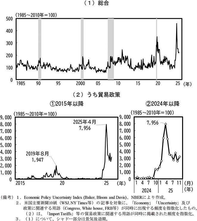 米国の通商政策をめぐっては、各国が米国との合意に達し事態が落ち着くまでの間、高関税が課される懸念が拭われなかったこと等から、経済政策に対する不確実性は非常に高まっていた。その動向を、米国の大学教授らが開発・公表している経済政策不確実性指数でみると、2025年の急騰は感染症拡大期を始めとする過去の経済ショックと比較しても突出していることが分かる(第1-1-27図(1))。さらに、貿易政策に関する指数をみると、相互関税が発動されたほか米中間での通商関係が非常に悪化していた2025年4月に過去最高水準に至るまで急騰しており、その水準はかつて米中貿易摩擦が激化した2019年8月のピークの約4倍に達したほどである(第1-1-27図(2))。その後、ピーク時からは低下したものの、2024年対比でみると依然として通商政策をめぐる不確実性は高い状況が続いてきたといえる。