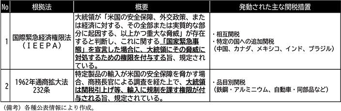 そもそも、トランプ大統領が今次の広範にわたる関税措置を講じた背景には、米国において多額の貿易赤字が継続していたことがあるとされる(第1-1-1図)。この構造的な要因として、2025年4月2日署名の大統領令3では、貿易相手国との二国間貿易関係における互恵性の欠如や、米国とは著しく異なる貿易相手国の関税率・非関税障壁等が指摘された。こうした状況を踏まえ、トランプ大統領は「国家緊急事態4」を宣言し、国際緊急経済権限法(International Emergency Economic Powers Act 。以下「IEEPA」という。)を根拠に相互関税を課すことが発表された。このほか、IEEPAに基づく中国等特定の国を対象とした追加関税措置や、1962年通商拡大法232条(以下「232条」という。)に基づく品目別の追加関税措置を実施するなど、広範に及ぶ措置がとられている5(第1-1-2表)。