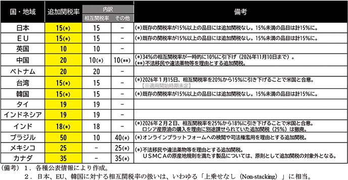その後、米国側はメキシコに対して、カナダと同様に違法薬物の流入問題への対処が不十分と指摘し、追加関税率を30%に引き上げる旨の通告を7月にしていたが、両国間での協議の結果、2026年1月現在に至るまでその発動は一時停止されており、実際に報復措置を発動したカナダとの扱いの差が見受けられる。