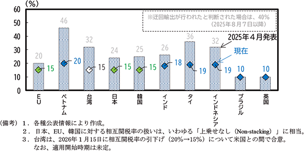 このように、第二次トランプ政権による広範な関税措置はあらゆる輸入品目に及んでいたわけではなく、こうした関税措置の対象外品目を主要な輸出品とする国・地域(例えば、先端半導体を主要輸出品とする台湾等)にとっては、米国の通商政策による世界的な経済変動の影響は受けるものの、関税による直接的な影響は相対的に限定的であった。