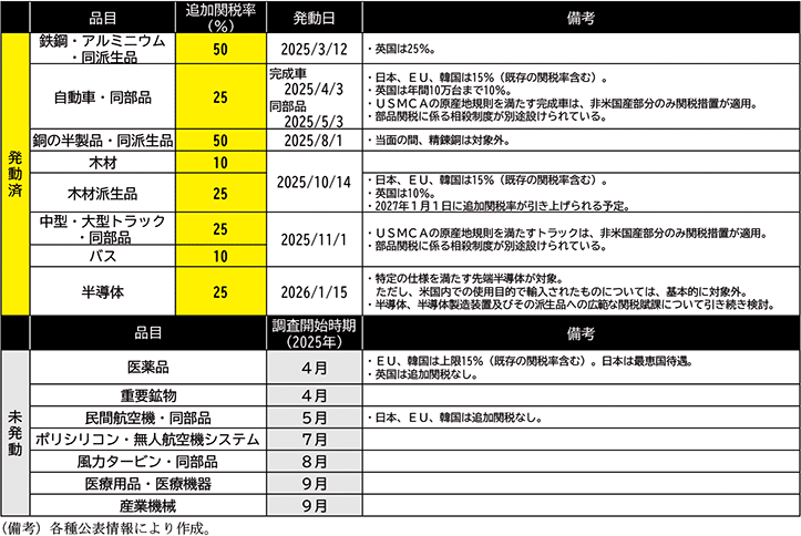 品目別関税についても、調査段階にもかかわらずトランプ大統領が発動を示唆する内容の発言等があったほか、発動後に更に適用範囲を拡大する動きもあるなど、その経緯は大きく揺れ動くものもあった。また、今後更なる適用範囲の拡大も見込まれており、関連の動向には引き続き注視する必要がある。以後では、米国の通商政策の主な動向を把握するに当たって、各品目別関税のうち、特筆すべき動向を整理する。