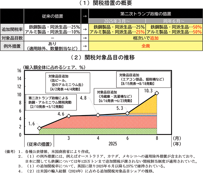 発動が決まったのは政権発足から1か月も経たない2025年2月10日、トランプ大統領が鉄鋼・アルミニウム及び同派生品の輸入に対し、25%の関税を課す大統領令に署名し、3月4日から実際に関税措置が適用されるようになった。ただし、鉄鋼・アルミニウムへの関税措置は今回新たに実施されたものではなく、既に第一次トランプ政権以降で適用されていたものを更に拡充するという位置付けとなっている。従来の措置と比較すると、今回の措置はアルミニウム製品・同派生品への関税率を引き上げた上で、対象品目を追加したほか、これまで特定の貿易相手国にとっていた例外措置を全廃したことで、関税措置の拡大が図られた(第1-1-9図(1))。その後も、6月4日以降追加関税率が50%にまで引き上げられたほか、相次いで対象品目が追加されており、関税措置の拡大が続いた10(第1-1-9図(2))。なお、9月17日には米国商務省が対象品目に係るパブリックコメントを募集しており、今後適用範囲が更に拡大する可能性も否定できないため、引き続きその動向には留意が必要である。