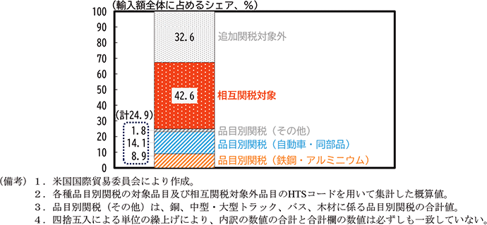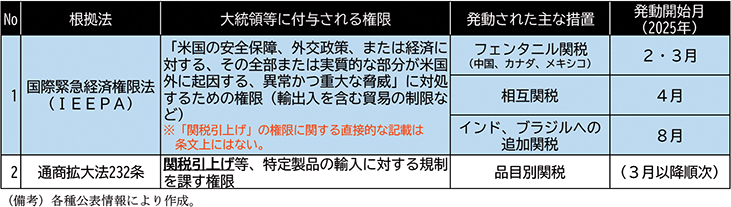 の関税措置の重複が回避されるよう整備され、重複があった場合には①~③の順に優先して適用されることとなった24。その後も、新たな関税措置が相次いで適用されたが、基本的には同種の事態に陥ることのないよう整備されている25。いずれにせよ、こうした措置も含めて、第二次トランプ政権による通商政策は複雑化したといえる。
