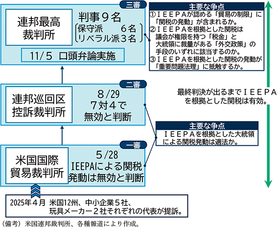 本節では、米国の通商政策の概況について整理してきたが、各種関税措置のうちIEEPAに基づく措置(相互関税等)については、その合法性ないし合憲性をめぐって2025年4月以降裁判所で係争中となっている。既に下級審においては違法判決が下されており、11月からは連邦最高裁で審理が開始された。本裁判の動向如何によっては、例えば一部の関税措置が過去に遡及して無効となりそれまで徴収された関税額の払い戻しも生じ得るなど、実体経済にも相当な影響が及ぶことが想定される。本コラムでは、こうした関税措置をめぐる裁判の動向についてフォローする。