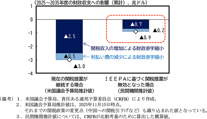 このように広範に及んでいたIEEPAに基づく関税措置が無効となった場合、これまで徴収されていた多額の関税の還付が、関税支払い義務のある米国輸入企業を中心に生じることが想定される34。米国財務省の公表データによれば、2025年以降、第二次トランプ政権の追加関税措置による関税収入の増加分は累計で既に約1,760億ドル程度と見込まれる。これに対して、別途米国税関・国境取締局から公表されているIEEPAに基づく措置による関税収入額は、2025年12月中旬までの累計で約1,330億ドル程度となっている35(図5)。これらのデータを比較すると、これまでの追加関税措置による関税収入の増収分のうち大部分がIEEPAに基づく措置に由来すると考えられることから、仮に最高裁での無効判決が出た場合、米国政府はこれまで追加関税により得られた関税収入の大部分を米国輸入企業に還付する必要に迫られる可能性がある。還付される企業にとってはキャッシュフローの大幅な増加であり、その影響を財政収支の面からみると、仮にIEEPAに基づく関税措置が無効になった場合、そうでなかった場合と比較して2025~2035年度の財政赤字縮小額(累計)が約3分の1にまで減少するとの米国民間機関の推計もある(図6)。