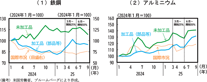 関税引上げを通じて米国内で物価上昇圧力が高まっていることが示唆されるが、その波及経路として、一つは米国での製品製造過程における投入コストの増加を通じた影響が考えられる。製造業における中間財の企業間取引価格の動向を確認すると、2025年以降上昇傾向にあることが分かる。特に加工品(部品等)については、2024年末までおおむね横ばいで推移していたところから上昇傾向に転じており、未加工品と比べて関税による影響をより強く受けていることが示唆される(第1-2-10図)。また、具体的な品目分類別の動向として、品目別の追加関税が課された鉄鋼・アルミニウム関連の品目に焦点を当てると、2025年3月及び6月の関税引上げに連動して、追加関税対象とされた加工品(部品等)で価格が上昇している場面がみられる。この間の国際商品市況の動向をみても、大幅な価格上昇は確認されないことから、関税引上げに伴って米国内での価格上昇が生じた可能性が高いといえる(第1-2-11図)。