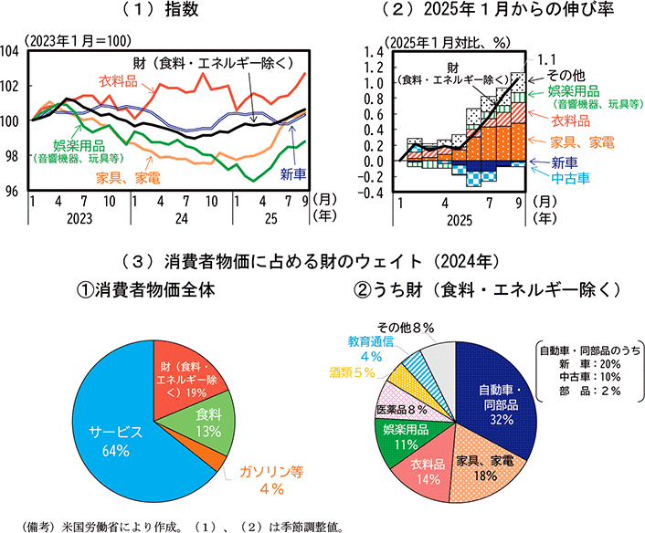 具体的な動向について、品目分類別で確認すると、相互関税が発動された2025年4月以降、家具、家電、娯楽用品(音響機器、玩具など)、衣料品といった品目の価格がそれまでと比べて上昇に転じていることが確認でき、関税引上げを通じて実際に米国内で物価上昇が起きたことが示唆される。他方で、新車価格をみると4月以降25%の追加関税が課されていたにもかかわらず、物価の大幅な上昇がみられない点が特徴的である(第1-2-14図(1))。こうしたそれぞれの動向を、財物価全体(食料及びエネルギーを除く)に対する寄与度でみると、関税引上げ後の財価格全体の上昇は確認されるものの、足下におけるその伸び率は2025年1月対比で1%程度にとどまっており、関税引上げ分のコストが完全に消費者物価にまで転嫁されたとはいえない(第1-2-14図(2))。また、財全体に占める各品目分類別のウェイトを確認すると、とりわけ価格上昇がみられなかった新車については財全体の20%と相当な割合を占めていることからも、自動車価格の大幅な上昇が生じなかったことが、財価格全体の上昇が小幅にとどまっている要因の一つになっているといえる(第1-2-14図(3))。