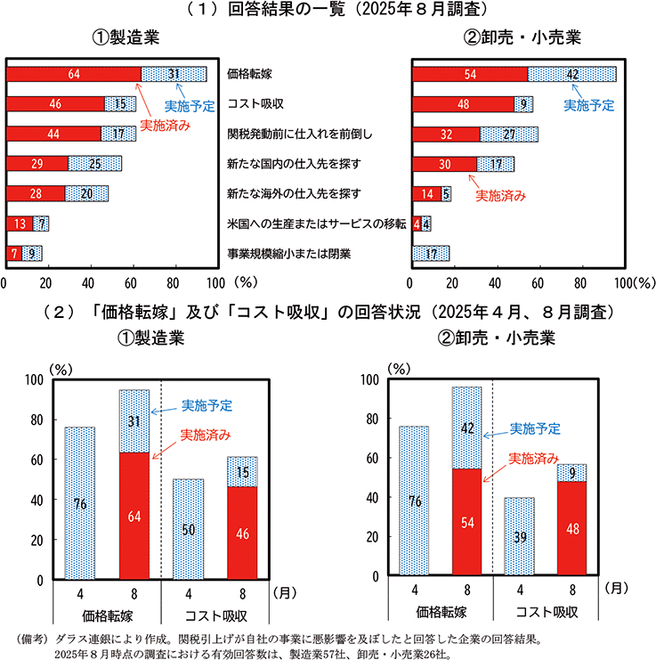 中でも特に実施済みとの回答割合が高かった「価格転嫁」及び「コスト吸収」について、相互関税発動直後の4月時点における回答状況と比較する(第1-2-18図(2))。まず「価格転嫁」については4月時点における実施予定との回答割合と比較して、8月時点での実施済みの割合は低くなっている。価格転嫁は十分に進んでこなかったことがうかがわれる。ただ、8月時点での実施済み及び実施予定との回答割合の合計は4月時点よりも高くなっていることから、企業の価格転嫁意向はこの間高まっていた。一方、「コスト吸収」についても同様に実施済み及び実施予定との回答割合の合計は4月時点より高くなっており、また卸売・小売業では4月時点の実施予定割合と比べると8月時点における実施済みの回答割合が高くなっている。