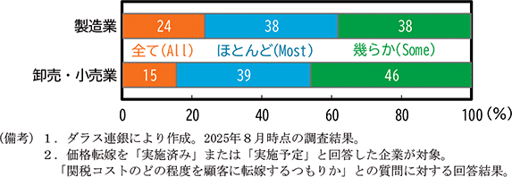 これらの結果から、関税によるコスト増への対応策として販売価格への転嫁のみに依存することは必ずしも容易ではなかったことがうかがわれ、その結果として増加分のコストを自社内で吸収する動きも相当程度生じていたことが確認される。実際、企業が負った関税引上げによるコストの増加分のうち、どの程度を販売価格に転嫁する予定かとの質問に対する同調査の回答状況をみると、コスト上昇分の全てを転嫁予定とした企業は2割前後にとどまっていた(第1-2-19図)。