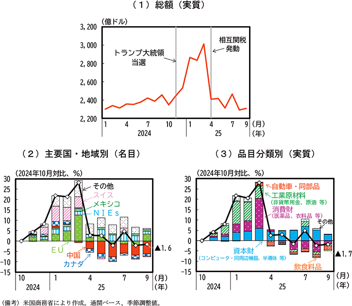 財輸入の動向を振り返ると、トランプ大統領による通商政策の動向を踏まえ、関税措置が課される前に各国があらかじめ米国への輸出を駆け込む動きがみられた。輸入総額を季節調整済実質値で確認すると、トランプ大統領の当選決定後から相互関税発動までの期間に当たる2024年11月~2025年3月において輸入額が大幅に増加した。関税引上げ前に旧税率で国内在庫を確保しておこうとする動きとみられる。その後、相互関税が発動された4月以降については、各国からの駆け込み輸出の影響がはく落した後、輸入額は駆け込み前と同程度の水準にまで戻っている。総体としては今般の関税措置による輸入規模の縮小は確認されていない(第1-2-1図(1))。