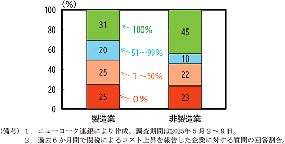 まず、類似の調査として、ニューヨーク連銀が管轄区域内の企業に対して2025年5月上旬に実施した調査がある42。同調査は製造業及び非製造業それぞれ約100社に対して実施された。なお、関税によるコスト増への直面状況について集計結果をみると、製造業は6か月前対比で関税対象となる輸入品が平均約20%価格上昇し、非製造業では同約15%価格上昇したことが確認された。こうした企業が関税によるコスト上昇分に対してどの程度を顧客に転嫁したかについて、調査の回答結果をみると、コスト上昇分を全て転嫁した企業の割合は、製造業で31%、非製造業で45%となっている一方で、転嫁割合が5割未満の企業もそれぞれ5割程度占めており、関税引上げによるコスト上昇分を相当程度企業が吸収していることが確認できる(第1-2-20図)。