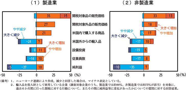 また、同調査では輸入品を取り扱っていることから関税による影響を相対的に強く受けやすい企業に対象を絞り、関税引上げへの対応状況や企業の純利益などへの影響に関する質問も実施された。その回答結果をみると、製造業及び非製造業のいずれもおよそ半数の企業が関税対象品目の販売価格を引き上げており、その割合は関税対象外品目の販売価格を引き上げたとの回答割合よりも高くなっている43。このほか、輸入品の仕入量については減少との回答割合が高い一方で国内品の調達量は増加したとの回答割合が高いことから、関税によるコスト増を回避するために仕入先を変更した動きも一定程度あったことが示唆される。また、設備投資や従業員数の削減を行ったとの回答も一定数みられており、関税コストの増加が企業の成長力を圧迫している様子もうかがわれる。そして、最終的な純利益でみると、製造業、非製造業ともに半数近くの企業が減少を報告しており、米国企業がマージンを削って関税引上げによるコストの上昇分を一定程度吸収している(第1-2-21図)。