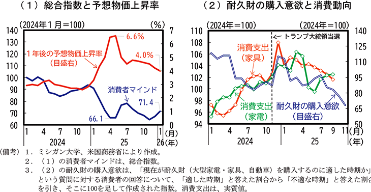 2024年以降の消費者マインドの動向をみると、通商政策による先行き不透明感や関税引上げに伴う今後の物価上昇懸念などを背景に、2025年に入ってから低調に推移している(第1-2-23図(1))。また、耐久財(大型家電、家具、自動車)の購入意欲に関する消費者マインドの動向をみると、トランプ大統領当選直後の2024年末をピークにその後大きく低下していることが確認できる。実際に同期間における耐久財の消費動向をみると、2024年末や相互関税発動前の2025年3月頃をピークにその後総じて減少傾向にあり、関税引上げに伴う物価上昇への警戒感から、消費者が先んじて耐久財を購入していたことがうかがえる(第1-2-23図(2))。