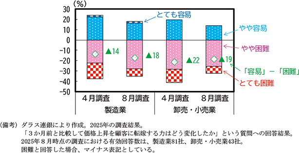 感染症拡大後、またロシアのウクライナ侵略後、米国を含め世界的にインフレ率が高まり、消費者の物価上昇に対する反発も強くなっていた。その中で、米国では更に関税引上げに伴う物価上昇懸念が高まり、米国消費者の物価上昇に対するセンシティビティ(敏感さ、感応度)は高まっていたと考えられる。こうした環境において、関税によるコスト上昇に直面した米国企業は顧客離れを回避し売上を維持するために、マージンの圧縮を受け入れてでも、価格引上げに慎重姿勢をとらざるを得なかった面があったと考えられる。こうした企業の価格決定力の低下は前述した地区連銀による調査結果からも確認されており、関税引上げによるコスト増分を販売価格に転嫁することについて、困難と回答する企業の割合は容易と回答する企業の割合を上回っている(第1-2-24図)。また、同様の傾向は定性的な情報からも確認されており、2025年8月の地区連銀経済報告(以下「ベージュブック」という。)では、ほぼ全ての地区の企業が価格の引上げに多少の躊躇があることが報告されており、その理由として、顧客の価格感応度の高さ、価格決定力の欠如、取引喪失への懸念が挙げられていた44。