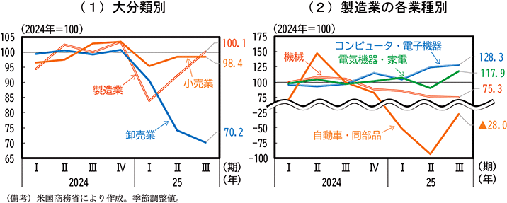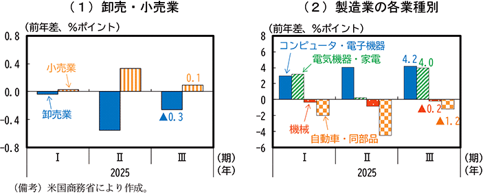 米国経済全体でみた企業収益の動向について、特に関税引上げによる影響が及んでいると考えられる製造業、卸売業及び小売業に焦点を当ててみると、小売業については関税引上げ後に大きな変化はみられない一方、特に卸売業では2024年対比で減収が続いていることが顕著となっている(第1-2-25図(1))。なお、製造業については2025年4-6月期まで減収傾向にあったところ、足下7-9月期の企業収益は昨年並みにまで戻っている。そこで、より具体的な業種別の動向をみると、コンピュータ・電子機器については、AI需要の高まりもあり2025年以降も堅調に推移している一方で、機械分野は減収傾向が続いているといったように、業種ごとの違いがみられる。その中でも特徴的なのは品目別関税の対象となった自動車・同部品であり、昨年対比で大幅に減収し、足下にかけては改善したものの、依然としてその水準は昨年対比で低くなっていることが確認される(第1-2-25図(2))。