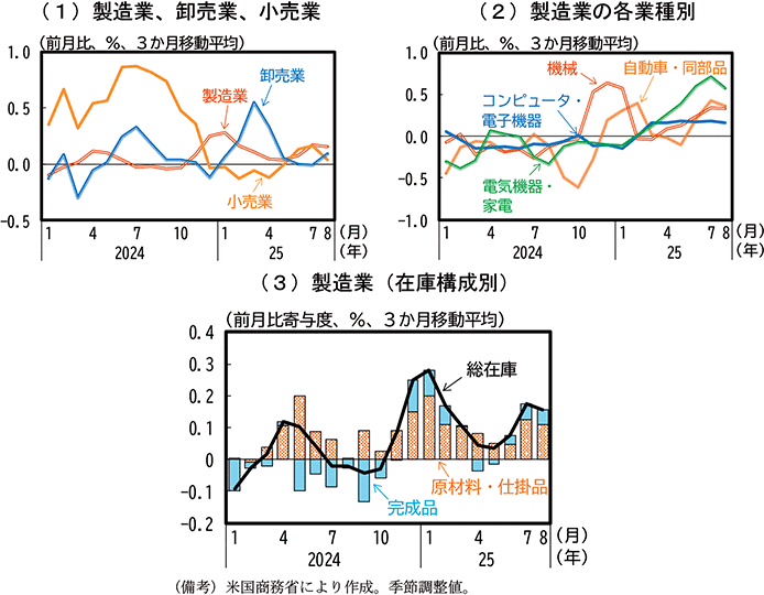 実際に金額ベースでの業種別の在庫動向を確認すると、製造業及び卸売業において関税引上げ前に在庫を積み増す動きが確認でき、特に卸売業においては相互関税引上げ前の2025年3月に在庫を積む動きが顕著となっている。一方、小売業については、2025年以降で同様の動きは必ずしも顕著にはみられない(第1-2-27図(1))。製造業については業種別で在庫動向を詳細にみると、2024年末から2025年初にかけて産業機械や金属加工機械などを含む機械製造において在庫の積み増しが顕著にみられ、3月までの間には自動車・同部品においても在庫の増加がみられる(第1-2-27図(2))。なお、製造業の在庫動向を原材料・仕掛品と完成品に分けてみると、2024年末から2025年初にかけて完成品に限らず原材料・仕掛品の増加ペースが上昇していることから、生産・調達を前倒しすることで在庫の積み増しを行っていた可能性が高いとみられる(第1-2-27図(3))。同様の動きは2025年の夏頃にも確認されており、夏以降に予定されていた相互関税率等の引上げを見越して再び調達の前倒しが進んでいた可能性も示唆される。