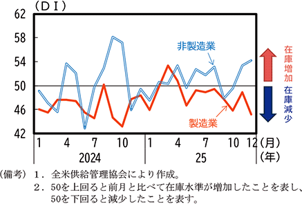 このように、在庫増減を活用した対応は、関税引上げ直後に消費者物価の大幅な上昇がみられなかった要因の一つでもある。ただし、この効果は在庫の払底とともに終わる。企業の景況感調査が示す在庫動向をみると、製造業・非製造業ともに春先にかけてDIは50を上回り在庫を積み増した後、製造業では5月以降継続的に前月対比で在庫が減少する傾向が続いており、非製造業についても9月には明確に50を下回ったことから、在庫水準は減少に転じている可能性が示唆される(第1-2-28図)。また、11月に公表されたベージュブック45では、クリーブランド連銀管轄地区において「大半の製造業者が関税導入前に確保していた低コストの在庫を既に使い切った」との指摘もあった。在庫調整による物価上昇圧力の緩和局面は既に終わっていると考えるのが妥当であろう。