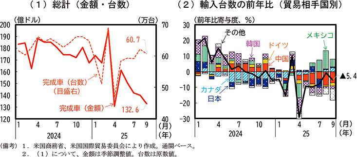 自動車については2025年2月にトランプ大統領が4月以降追加関税(25%)を課すことを表明したことから、関税引上げ前の3月に各国からの輸入が急増し、翌4月にはその反動減が生じるという顕著な動きがみられた。その後の動向をみると輸入総額は減少基調で推移した一方、台数ベースでは減少基調は確認されなかった(第1-2-2図(1))。この一因として、例えば日本の自動車企業の多くは、米国の追加関税が発動されるとともに、関税賦課前の輸出価格を大幅に引き下げることで現地販売価格を維持し、輸出台数への影響を最小限に抑えようとする動きがみられた(後掲第1-2-8図参照)。自動車の輸入台数の動向を2024年対比で貿易相手国別にみると、関税引上げ後に中国、韓国、ドイツなどからの輸入台数は減少基調で推移した一方、日本からの輸入台数では同様の動きはみられないという違いがみられた37(第1-2-2図(2))。