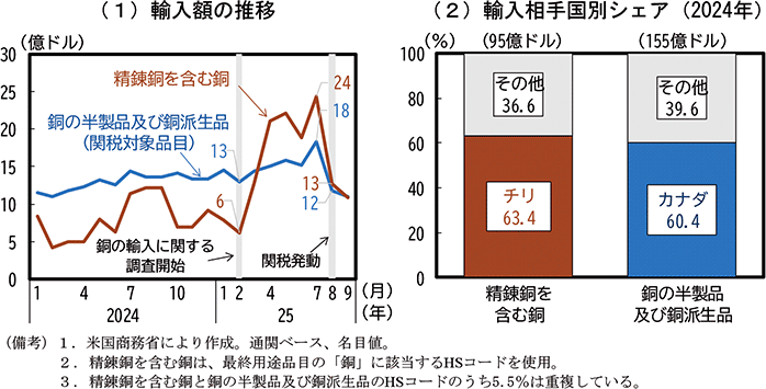 次に、銅及びその関連製品について輸入額の推移をみると、232条に基づく調査が2月から開始されたことを受けて、関税発動を見越して特に原料に当たる精錬銅を含む銅の輸入が急増した。その後、7月9日にトランプ大統領が8月1日以降50%の追加関税を課す意向を表明したことから、半製品及び派生品を含めて幅広い関連品目で7月に駆け込むように輸入が増加した末に、7月30日の大統領令により追加関税措置が決定すると、翌8月の輸入額は急落した(第1-2-3図(1))。このように、関税発動前後で駆け込みとその反動が確認されたわけだが、ここで留意しておくべきは、結果的に追加関税対象となった銅の半製品及び派生品に限らず、対象とならなかった精錬銅でも同様の事象が生じた点である。米国側の追加関税措置の内容が具体的に決まるまで対象品目は定かではなく、こうした通商政策をめぐる不確実性が、この間の各国からの輸入に影響を及ぼしていたことが確認できる。なお、精錬銅を含む銅、銅の半製品及び銅派生品の輸入額はそれぞれチリ、カナダが約6割のシェアを占めており、銅の関税をめぐってはこれら2国が多分に影響を受けることとなった(第1-2-3図(2))。