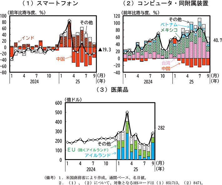次に、相互関税の適用対象外となった代表的な品目として、スマートフォン、コンピュータ・同附属装置及び医薬品の輸入動向を確認すると、いずれも相互関税発動前の2025年3月までの間に輸入は増加基調で推移したが、その後の動向については違いがみられる。