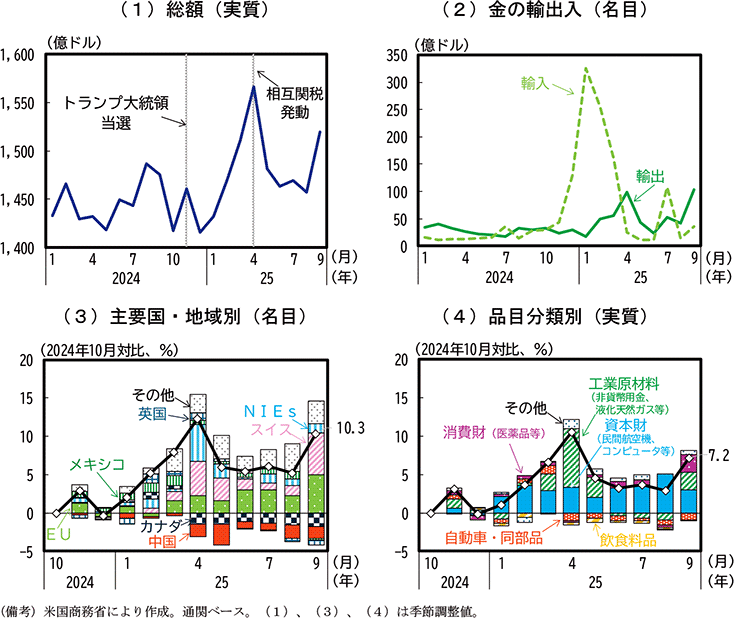 まず、米国側からみた財貿易の動向を確認する。その際、通商政策をめぐる先行きの不透明感を背景とした各国からの駆け込み輸出やそのはく落及び反動減といった一時的な動きも生じたことから、前節で整理した各種関税措置の動向との関係性に焦点を当てつつ概観する。