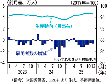 また、米国内への製造業の生産回帰も関税措置の理由の一つであったが、これについても、本稿執筆時点(2026年1月)では、米国製造業の雇用者数は減少傾向が続いている41(第1-2-7図)。各国との交渉の結果、米国内に多額の直接投資や工場進出が予定されている。具体的な案件組成には時間を要するため、その影響については長期的な視点で確認していく必要がある。こうした直接投資の約束が実際に米国製造業の生産や雇用動向にどのような影響を与えるのか、若しくは与えないのか、通商政策自体の動向と併せて、中長期の視点からも注目していくことが適当であろう。