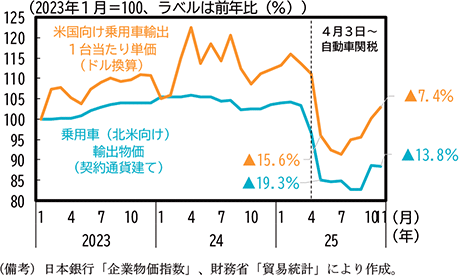 第二次トランプ政権は広範に及ぶ追加関税措置を実施しており、これに伴う事業者側のコスト増は経済全体で相当程度生じたといえる。こうした状況下において、輸出元の事業者が採り得る価格戦略の一つとしては、関税引上げによるコストの増加分を自社内で吸収し、米国内での販売価格の上昇を回避することで、市場での価格競争力を維持することが考えられる。この点、日本の米国向け自動車輸出価格の推移をたどると、自動車への追加関税(2025年4月当初時点で25%)が課された後、これを相殺するように輸出価格が2割程度低下しており、自国内で関税コストの大部分を吸収したことがうかがわれる(第1-2-8図)。
