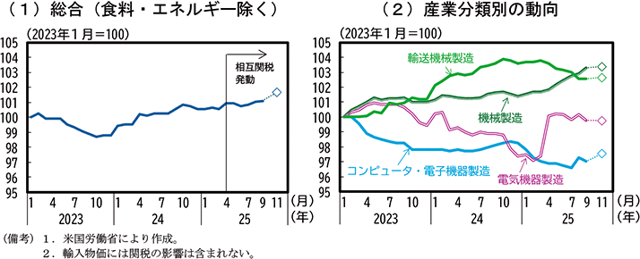 まず輸入物価の動向について、市況との連動によって変動しやすいエネルギーや食料を除いたベースでの推移を確認する。今般の相互関税措置は、全貿易相手国からの多くの輸入品目が追加関税の対象となったことから、仮に各国内でコストを吸収する動きが進んでいるようであれば輸入物価全体にも相応の下押し圧力がかかるはずであるが、実際の動きをみると関税引上げ後の大きな変動は確認できない(第1-2-9図(1))。個別の動向として、品目別関税(鉄鋼・アルミニウム、自動車・同部品等)が影響し得る産業分類の輸入物価に焦点を当てても、同様に大きく低下する動きは確認できなかった(第1-2-9図(2))。関税によるコスト増の影響に米国内の多くの企業が直面した可能性が高いといえる。
