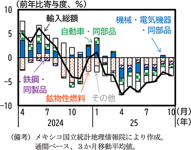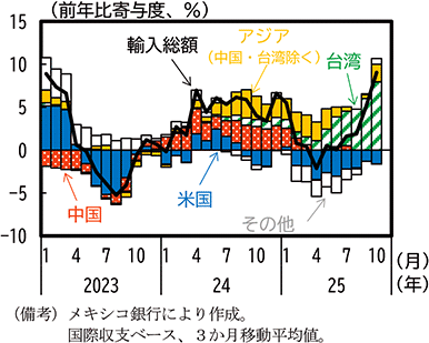 財輸入については、カナダとは対照的に米国に対する対抗的な関税引上げを行っていないものの、2025年以降米国からの輸入は前年比減少傾向で推移している(第1-3-9図)。米国からの輸入動向を通関ベースでみると、2024年半ばから減少傾向にあった鉱物性燃料に加え、2025年春以降は自動車・同部品や機械類等幅広い品目で輸入が減少している(第1-3-10図)。一方、2025年半ばから台湾からの輸入が急増している。メキシコのコンピュータ等の輸出増加に伴って、半導体等の台湾からの中間財輸入が増加しているものとみられる。