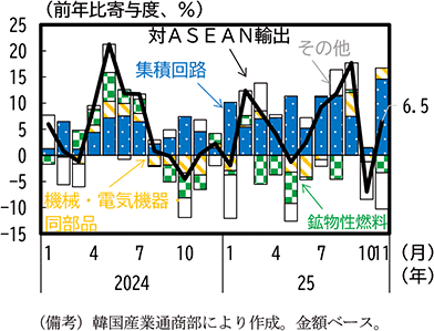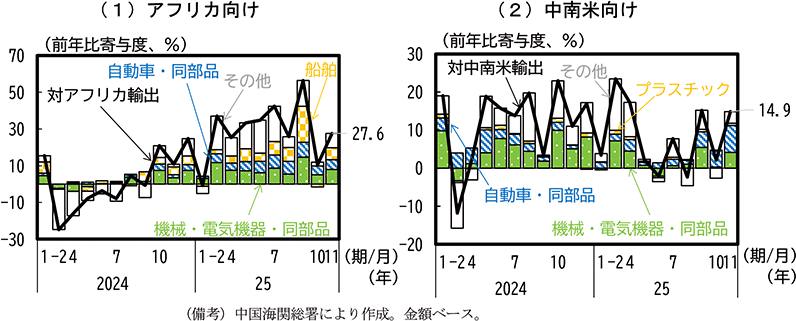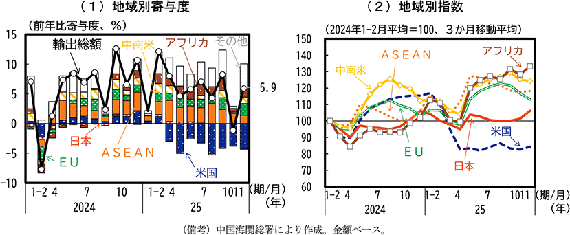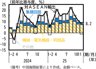 アジアでは、中国や韓国は相互関税や自動車関税の引上げの影響を受けて対米輸出が減少した一方、台湾やASEAN諸国ではメキシコと同様にAI関連需要を背景に、相互関税の適用除外となっているコンピュータ・同附属装置を中心に対米輸出は増加を続けている。中国や韓国ではこれらの国々に対する集積回路等の輸出が大幅に増加し、両国の財輸出全体としては増加基調を維持している。