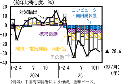 その上で、中国からの米国向け財輸出をみると、相互関税率が引き上げられた4月から携帯電話、コンピュータ、機械・電気機器などを中心に対米輸出額は減少に転じ、6月には減少幅が縮小したものの、その後も前年比のマイナスは継続した。10月に米中間の関税率引下げ等の合意がされたものの、11月においても対米輸出は引き続き前年比マイナスで推移している(第1-3-13図)。