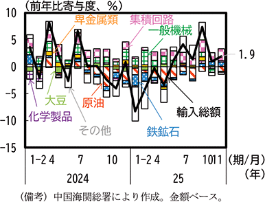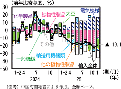 米国からの財輸入の動向を確認すると、2025年3月以降、輸入総額は減少が続いており、品目別にみると鉱物性製品や農産物のうち大豆等の輸入が減少していることが分かる。このうち鉱物性製品については、前述のように米国のフェンタニル関税の導入に対抗し、2月から米国からの石炭、原油、天然ガス輸入に追加関税を賦課したことから、1-2月期に輸入が減少に転じた。その後、米国産原油の輸入が縮小されたこともあり、その減少幅は拡大した。一方、米国からの通信装置などの電気機械の輸入は増加が続いている(第1-3-17図)。