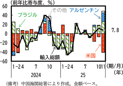 さらに中国の財輸入のうち、米国における対中輸出のシェアの高い大豆について2025年の動向をみる。前述のとおり、2月と3月に米国は中国に対してフェンタニル関税を賦課したが、これに対し、3月に中国は対抗措置として米国からの農林水産物に対する追加関税措置をとった。そのため3月以降は米国からの大豆輸入が減少する一方で、2025年初頭は減少傾向にあったブラジルからの輸入は5月以降増加傾向となった。