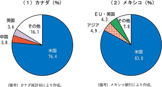 はじめに、他国に先んじて関税引上げの対象となったカナダ、メキシコ経済に与えた影響から確認する。第二次トランプ政権発足前の2024年時点における両国の貿易構造を確認しておくと、両国とも財の輸出先の約8割が米国となっており、貿易面で米国への依存度が高い(第1-3-1図)。
