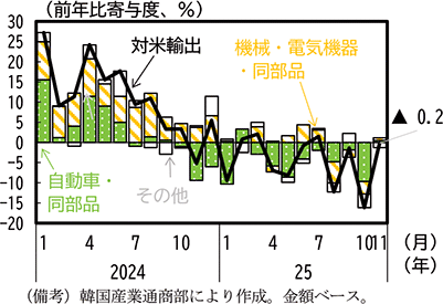 第1節でみたように、米国の韓国向け関税措置については、2025年4月から10%の相互関税及び25%の自動車関税が課され、8月からは相互関税率が15%に引き上げられた。その後、10月末の米韓首脳会談を受けて、12月初旬の米国官報において自動車関税は15%(既存の関税率を含む)に引き下げられた。これを踏まえて米国向け財輸出の動向を確認すると、米国の自動車への関税措置の影響により自動車輸出の減少が続いていることもあり、対米輸出全体も減少傾向となっている(第1-3-20図)。