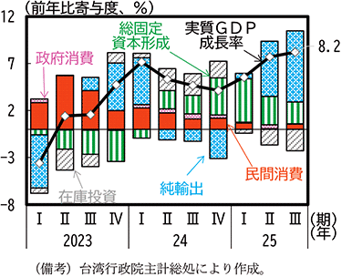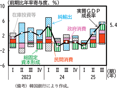 2025年の韓国の実質GDP成長率をみると、1-3月期は、政治的な対立に端を発する社会の混乱54とともに消費者マインドの落ち込みもあり民間消費はマイナス、投資もマイナスの寄与となった一方で、純輸出はプラス寄与であった。4-6月期以降は新政権の発足を受けた期待感もあり消費はプラスに転じ、純輸出も半導体関連の輸出が好調なこともあり引き続きプラス寄与となったため、実質GDP成長率もプラスとなった。足下の7-9月期では消費刺激策55などから消費のプラス寄与は更に拡大し、前期比年率5.4%のプラス成長となり、景気は持ち直している(第1-3-22図)。
