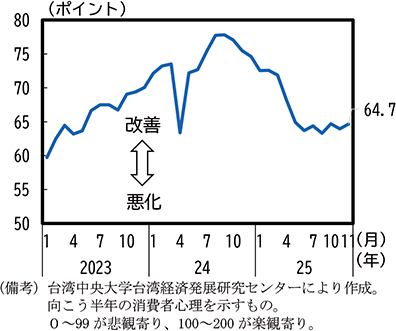 台湾の実質GDP成長率は、AI関連需要を受けて好調な輸出により純輸出の寄与が拡大し、高水準で推移している。2025年4-6月期は在庫投資がマイナス寄与となった一方、純輸出のプラス寄与が前期から高まったことにより前年比8.0%の伸びとなった。7-9月期は純輸出のプラス寄与が更に拡大して前年比8.2%の高い成長率となっており、景気は回復している(第1-3-26図)。輸出を中心として高い成長率が続く一方で、国内消費は低調であり、消費者マインドも改善していない。輸出主導の経済成長の恩恵が国内に十分に還元されていない点には注意が必要である(第1-3-27図)。