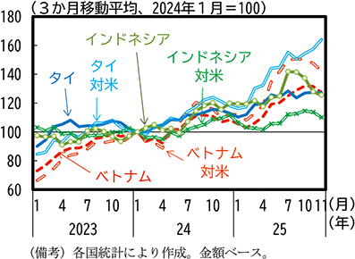 ASEANでは、米国の関税引上げ後も対米輸出は増加し、輸出全体も増加基調で推移している(第1-3-28図)。ここでは、ASEANのうち、2025年以降も財輸出の増加傾向が顕著なベトナム、タイ及びインドネシアについて、米国向けの財輸出と中国からの財輸入の動向について確認する。