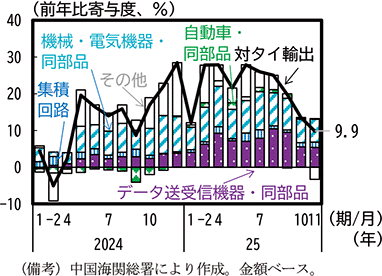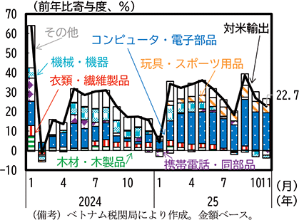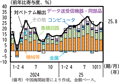 あわせて、中国からベトナムへの財輸出をみると、品目の構成では機械や集積回路が多数を占めている。2025年は、4月の米国の相互関税措置以前から、機械等や集積回路は増加が続き、9月以降は伸び率がやや低下する動きがみられたが、足下にかけても前年比20%を超える伸び率を維持している。輸出総額全体は前年比増加で推移しており、コンピュータ、機械・電気機器を始めとして総額が減少している対米輸出とは異なっている(第1-3-30図)。
